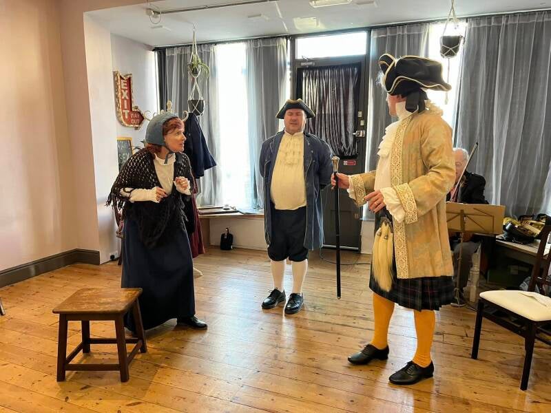 Rehearsing for Outlandish! at The Actors, Brighton in October 2024. Featuring: Sam Nixon (Flora Macdonald/Donalda Macdonald); Phil Nair-Brown (Bonnie Prince Charlie/Samuel Johnson); Alasdair Carson-Sheard (Angus Macdonald/Captain Con O'Neil); and Mark Priestley as the violinist.